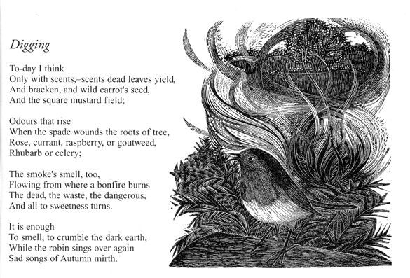 Digging Poem by Edward Thomas with original wood engraving by Yvonne Skargon